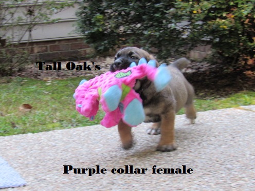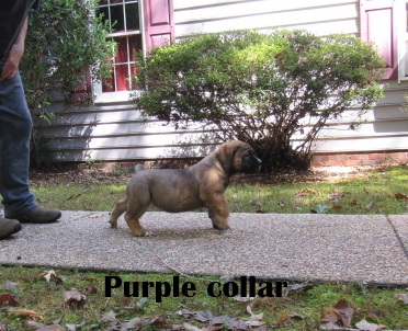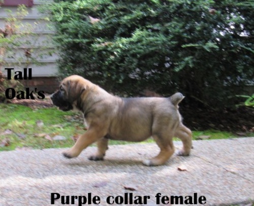 | Purple collar female pictured at 6 weeks old she is available call Bev 804-633-9612 This litter pups are very uniformed litter ,very happy with everyone of these pups . Purple collar is available email talloakskennels@gmail.com |